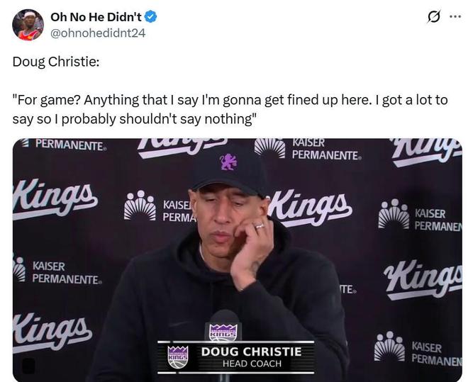 國(guó)王主帥克里斯蒂賽后表示:“我本想說(shuō)些什么,但說(shuō)什么都肯定會(huì)被罰款,所以還是不說(shuō)了吧?!?/p>